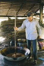 เราจะพาคุณไปชมไร่จาก รวมถึงการทำน้ำตาลจากให้กลายเป็นผลิตภัณฑ์แปรรูปต่าง ๆ ณ ไร่จันทรังษี แห่งบ้านขนาบนาก จากอากาศร้อนระอุกลับค่อย ๆ เย็นลง เมื่อเราเดินเข้ามาในไร่จาก ไปดูการเคี่ยวน้ำตาล ที่มีบรรยากาศคล้ายโรงถ่าน มีกระทะใบใหญ่ตั้งไฟพร้อมน้ำตาลจากที่กำลังส่งกลิ่นหอมได้ที่ เราลองชิมดูแล้วรู้สึกว่ากลมกล่อมและหอมมาก โดยน้ำตาลจากที่ผ่านกระบวนการแล้วจะถูกนำไปใช้แทนน้ำตาลมะพร้าว (น้ำตาลปี๊บ) ในการปรุงอาหารหรือทำขนม เป็นที่นิยมของคนท้องถิ่นและอำเภอใกล้เคียง